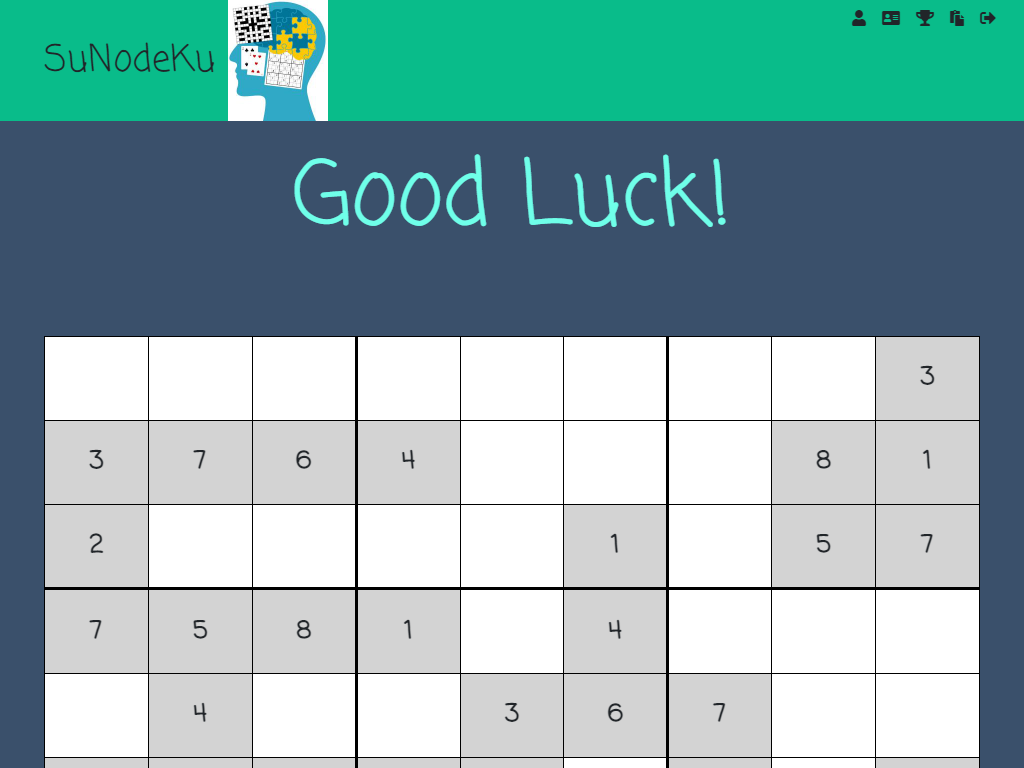 Javascript MySQL NodeJSSuNodeKu was our second group project for Full Stack boot camp. This project was about utilizing a MySQL database to create a RESTful API. It is a Sudoku game that uses API calls to play Sudoku, features leaderboards and a forum to ask for help on puzzles. My main contribution was the Sudoku game.